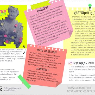 If you are curious about the doctoral research project that I’m working on at the University of Exeter, I have participated with this design in the Research Poster Competition that took place at the university from 13th to 16th June 2022, and has been awarded with the Most Innovative Poster prize 2022! Doctoral thesis: Statues’ … More Statues’ Rumours Poster awarded with the Most Innovative Poster Prize 2022 – University of Exeter